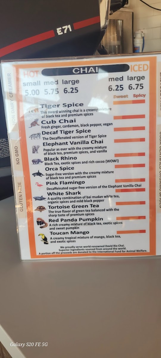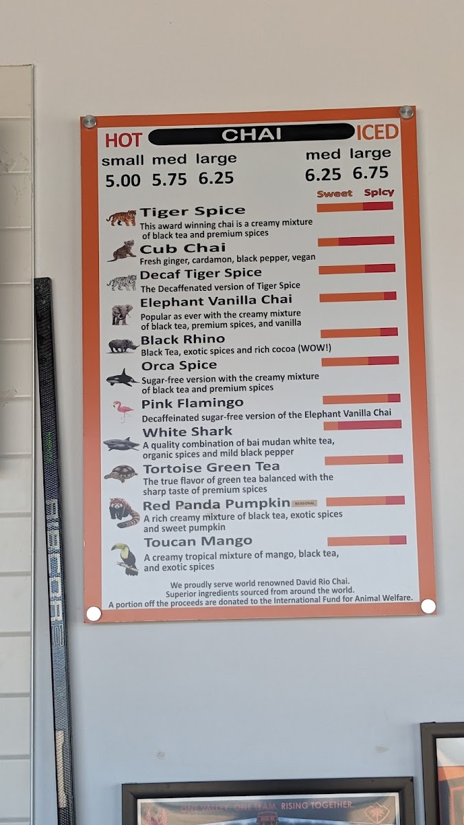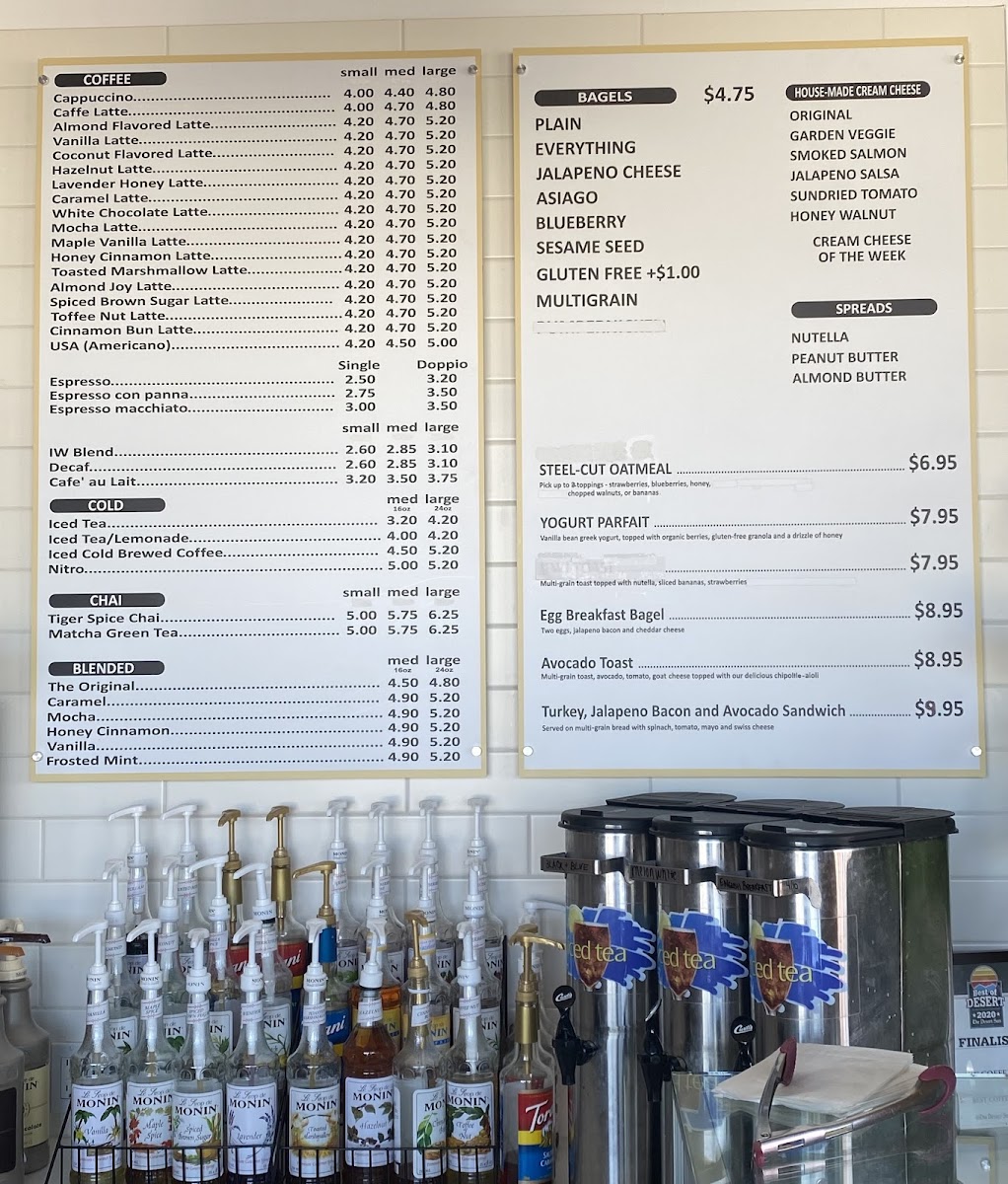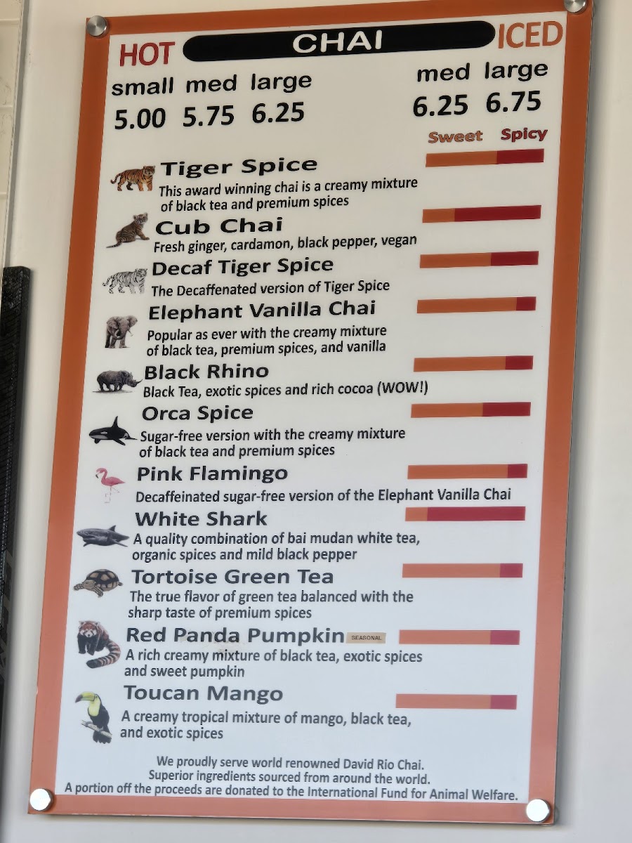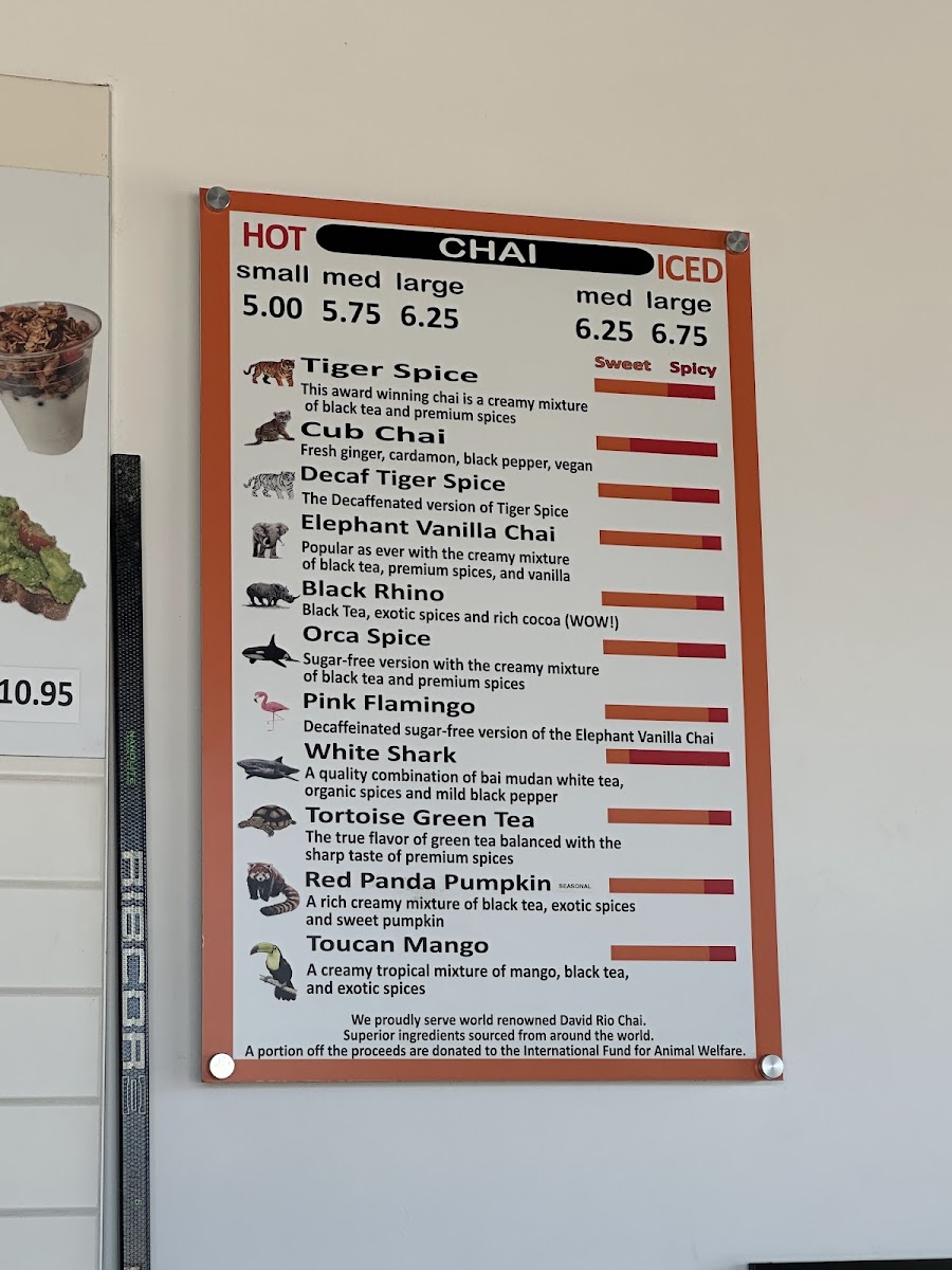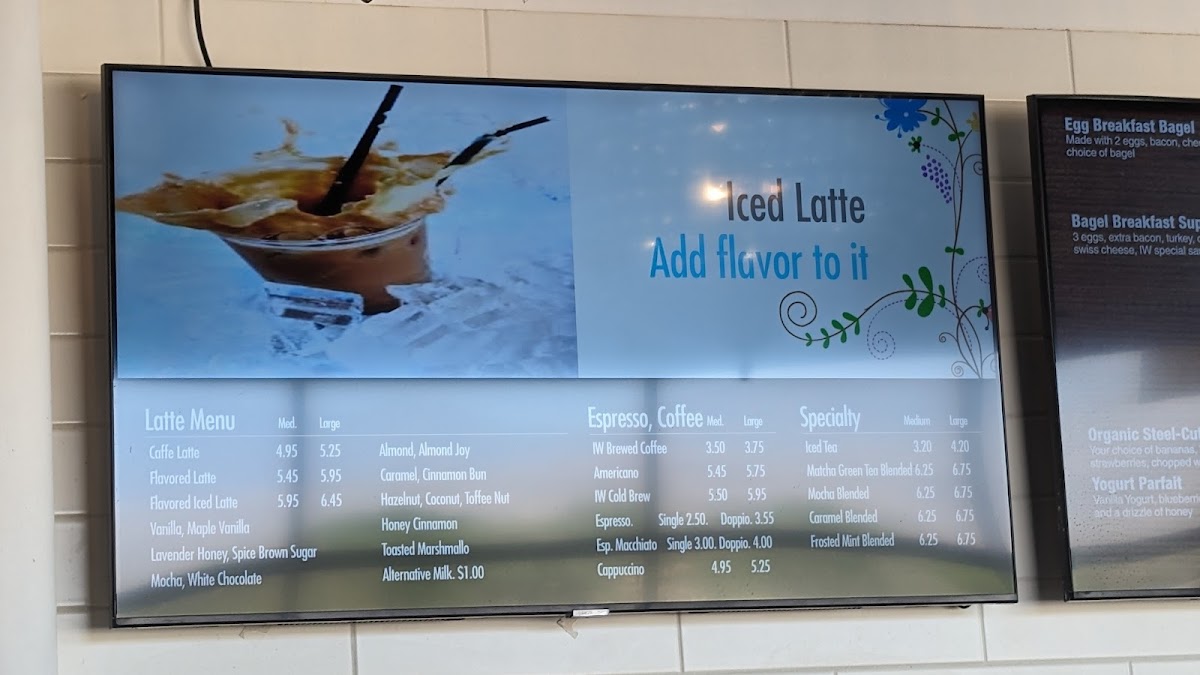 As a final takeaway, the menu at Iw Coffee & Chai Bar feels thoughtfully curated, balancing comfort classics with distinctive house flavors. On the chai side, options like Tiger Spice, Cub Chai, Decaf Tiger Spice, Elephant Vanilla Chai, and Black Rhino deliver warmth and spice that set a cozy tone. Coffee lovers are well covered with espresso staples such as Iw Brewed Coffee, Americano, Espresso, Esp. Macchiato, Cappuccino, and Caffe Latte, alongside crowd-pleasing variations like Flavored Latte, Flavored Iced Latte, Almond Flavored Latte, Vanilla Latte, and Coconut Flavored Latte. For something a bit more indulgent, the specialty and blended selections-Matcha Green Tea Blended, Mocha Blended, Caramel Blended, Frosted Mint Blended, The Original, Caramel, Mocha, Honey Cinnamon, and Vanilla-add a dessert-like twist without overwhelming the menu.